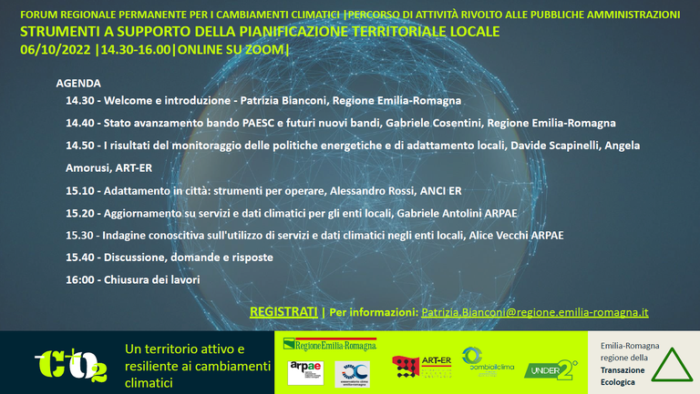 Il webinar Strumenti a supporto della pianificazione territoriale locale è organizzato nell’ambito del percorso per gli enti locali del Forum permanente cambiamenti climatici della Regione Emilia-Romagna.