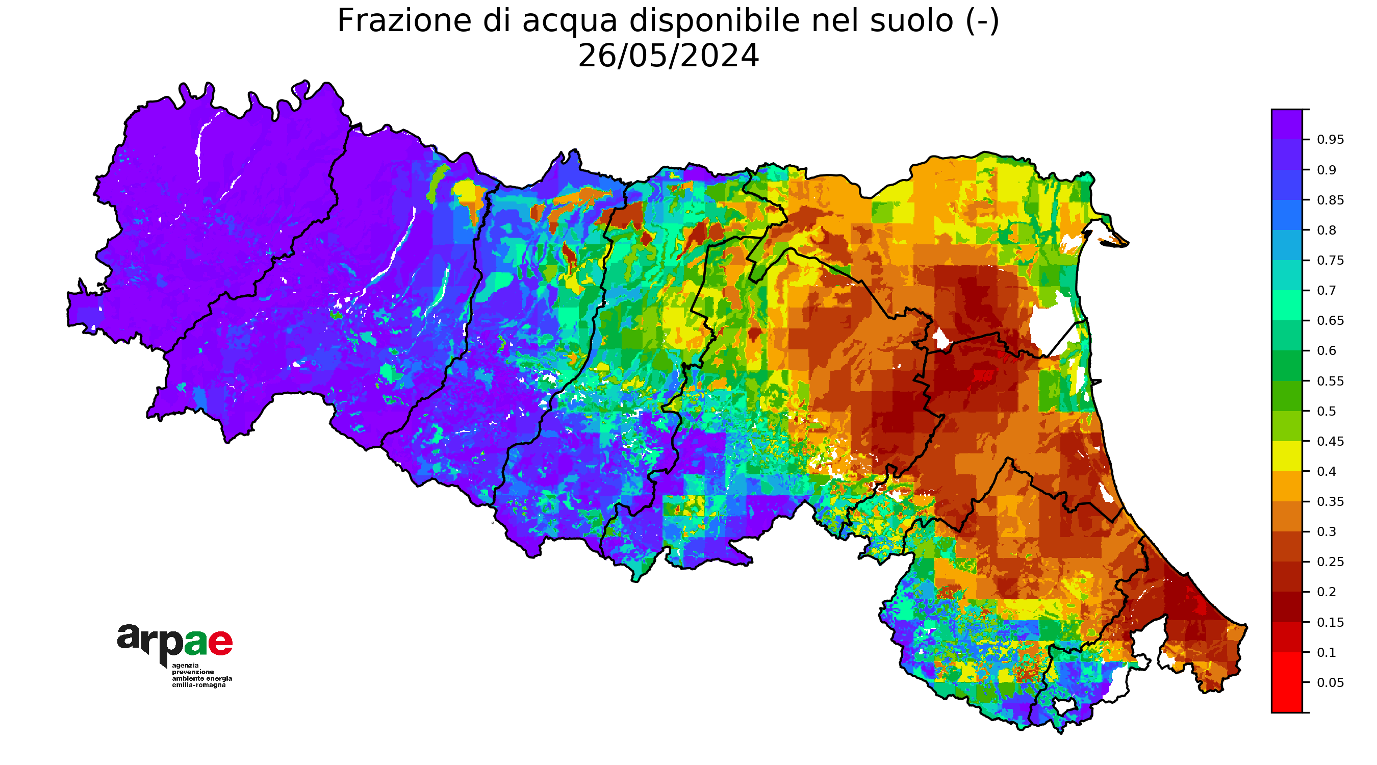 A fine maggio, le precipitazioni cumulate da inizio ottobre (anno idrologico) si presentano ovunque superiori alla norma, con valori compresi tra il 75° e il 95° percentile rispetto al periodo 1961-2020. Questo quadro si ripercuote sul contenuto idrico dei suoli (Fig. 1) che risulta alto su tutto il territorio regionale: la frazione di acqua utile a metà maggio presenta infatti valori prossimi alla capacità di campo su buona parte della pianura. Inoltre, il livello della falda ipodermica rispetto al piano di campagna risulta ovunque superiore o fortemente superiore alla media per il periodo. Complessivamente, la disponibilità idrica regionale a inizio estate è superiore alla norma.