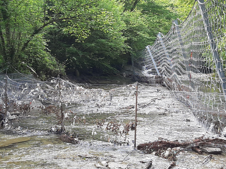 In località Molino della Lastra, a circa 5 km a valle della zona della frana, è stata di recente installata sul rio una nuova rete di contenimento per la raccolta dei rifiuti, idonea a resistere a eventuali nuove piene del corso d’acqua. In questo punto erano visibili alcuni frammenti di rifiuti, prevalentemente sacchi di contenimento rifiuti e stoffa.