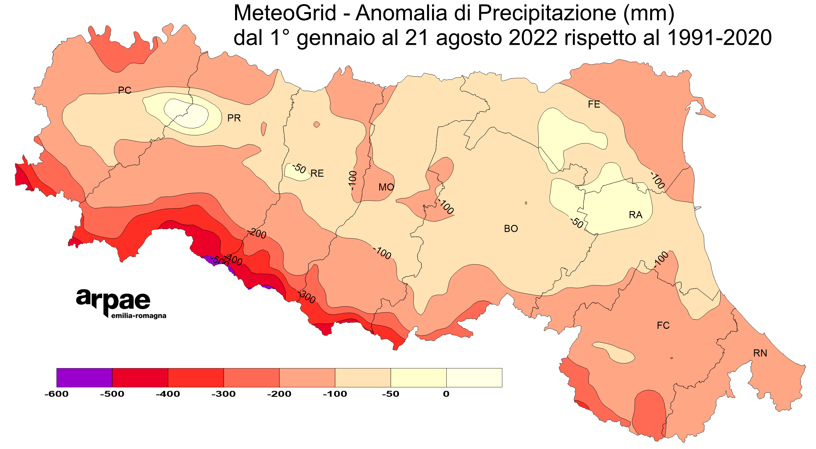 Le intense piogge della seconda decade di agosto hanno provocato, localmente, gravi danni per grandine e vento forte e non risolto la situazione di grave siccità che si sta protraendo da mesi. Dal 16 al 19 agosto sono caduti circa 60 mm medi regionali, con punte prossime o superiori a 140 mm sulla bassa collina occidentale, tra Parma e Reggio, tra Piacenza e Parma e nella pianura tra Ferrara e Bologna. Segnalati gravi danni alle colture, alle strutture agrarie, alle infrastutture e alle strutture civili per pioggia intensa, per grandine e per vento forte in particolare nel ferrarese, a Bondeno, nel parmense e nel modenese. La precipitazione cumulata mensile al 21 agosto (media regionale) è pari a circa 76 mm, quantitativo superiore a quello generalmente atteso climaticamente (valore stimato 34 mm, secondo il clima di riferimento 1991-2020). Più info nel Rapporto post evento meteo dal 17 al 19 agosto 2022