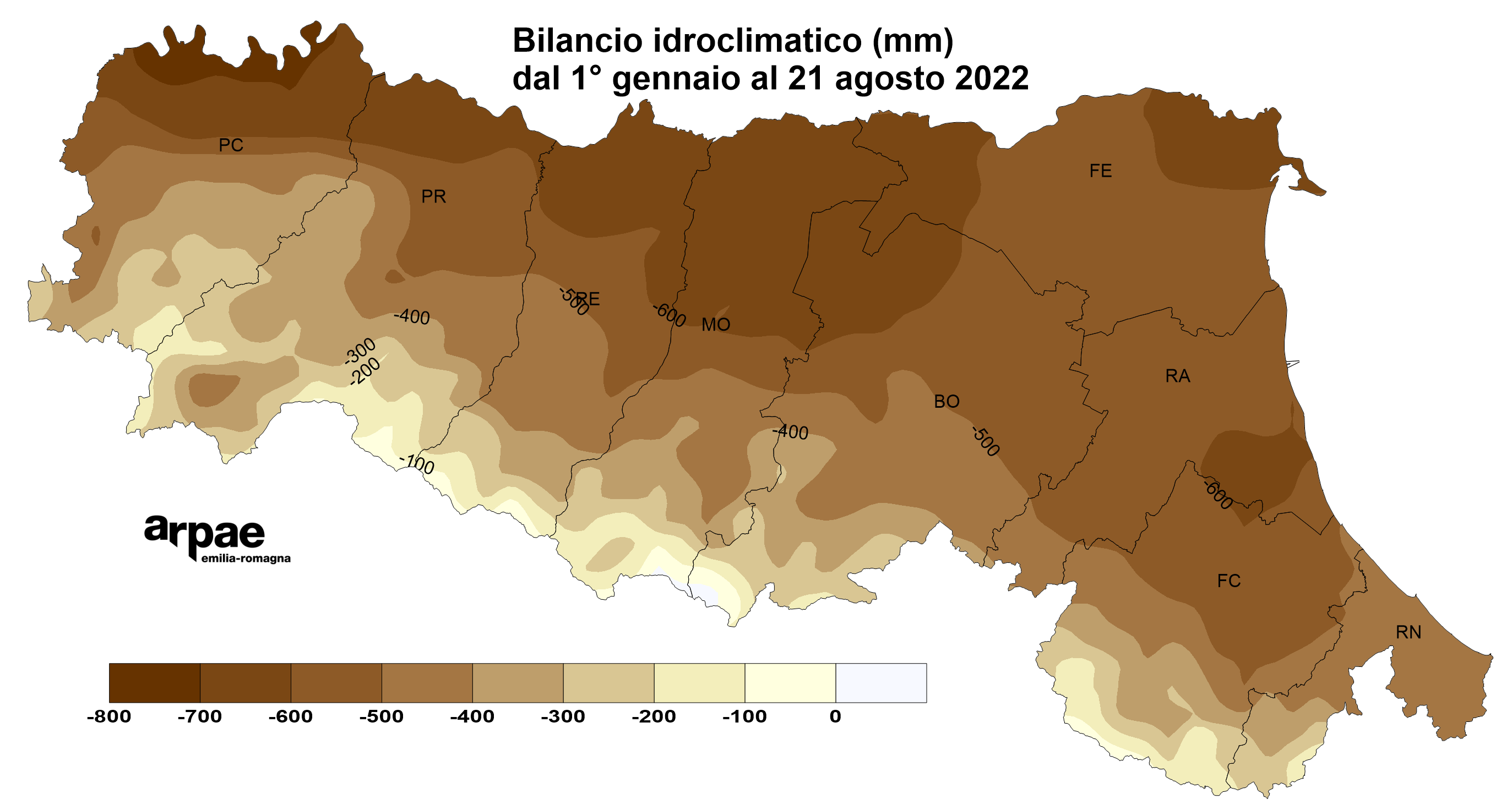 Le ultime piogge hanno leggermente migliorato la situazione del bilancio idroclimatico da inizio anno che, pur restando fortemente negativo, ha diminuito il deficit di circa 30 mm, passando da un valore medio regionale di -496 mm del 15 agosto al valore di -464 del 21 agosto.