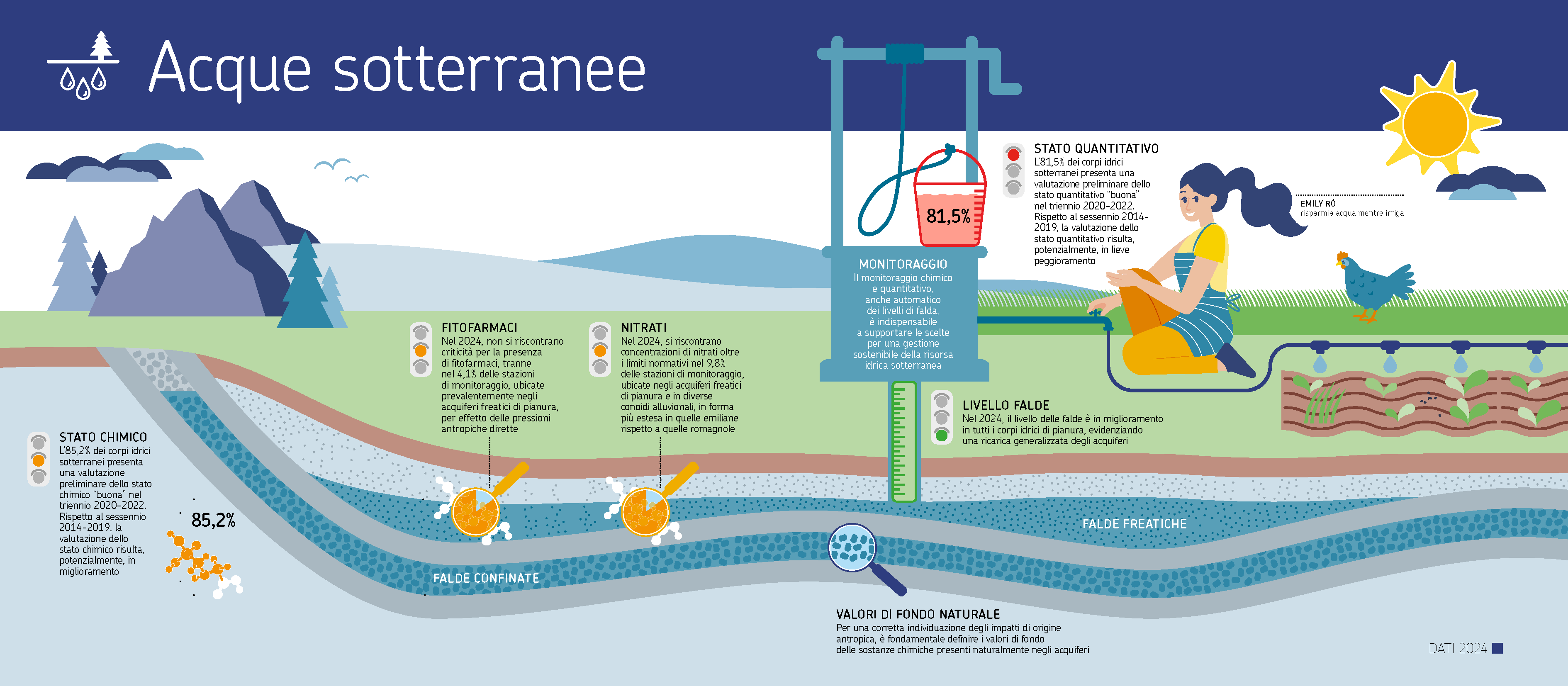 In Emilia-Romagna i principali contaminanti delle acque sotterranee sono nitrati e fitofarmaci. I primi si trovano prevalentemente nei corpi idrici delle conoidi alluvionali, i secondi nei corpi idrici freatici di pianura.