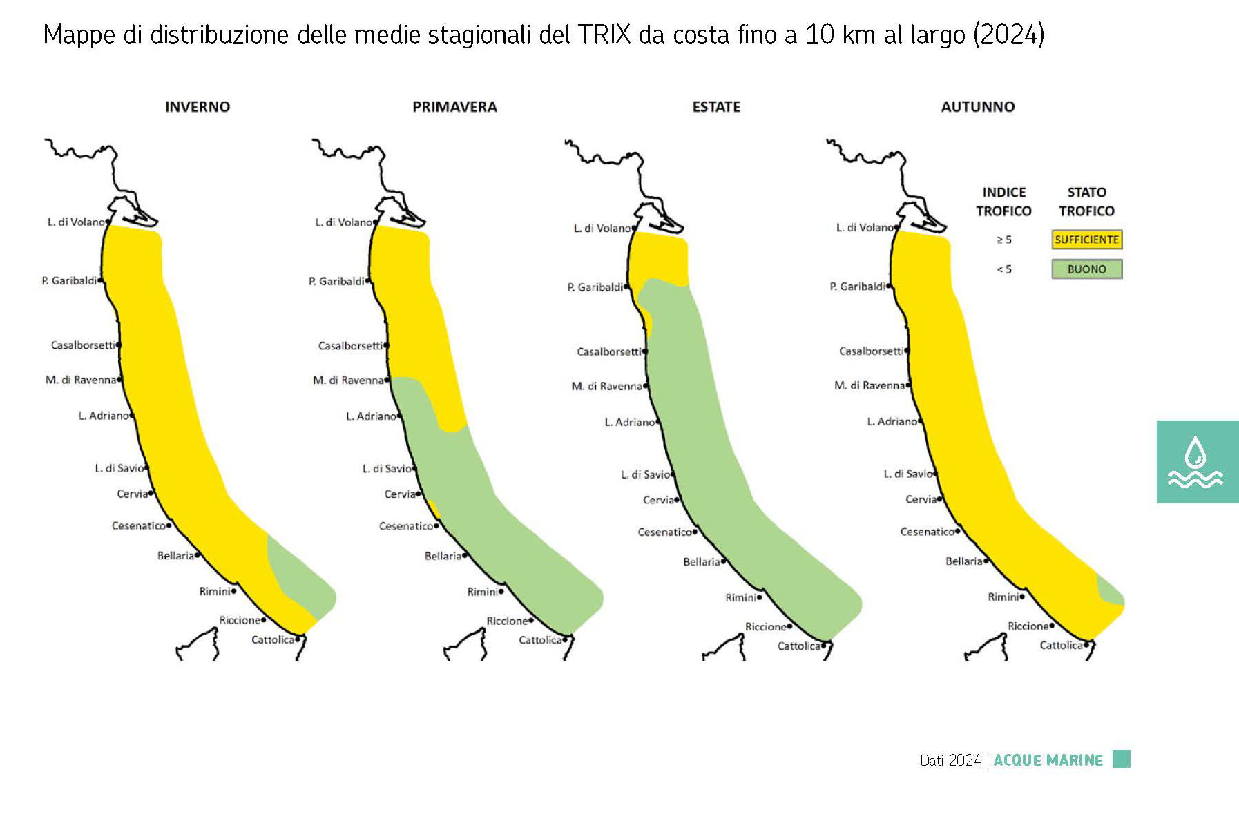 Le stagioni più critiche, relativamente ai valori del TRIX, sono risultate l’inverno, l'autunno e, in misura minore, la primavera. Infatti la colorazione del TRIX risulta gialla lungo quasi tutta la costa, a causa degli apporti fluviali.