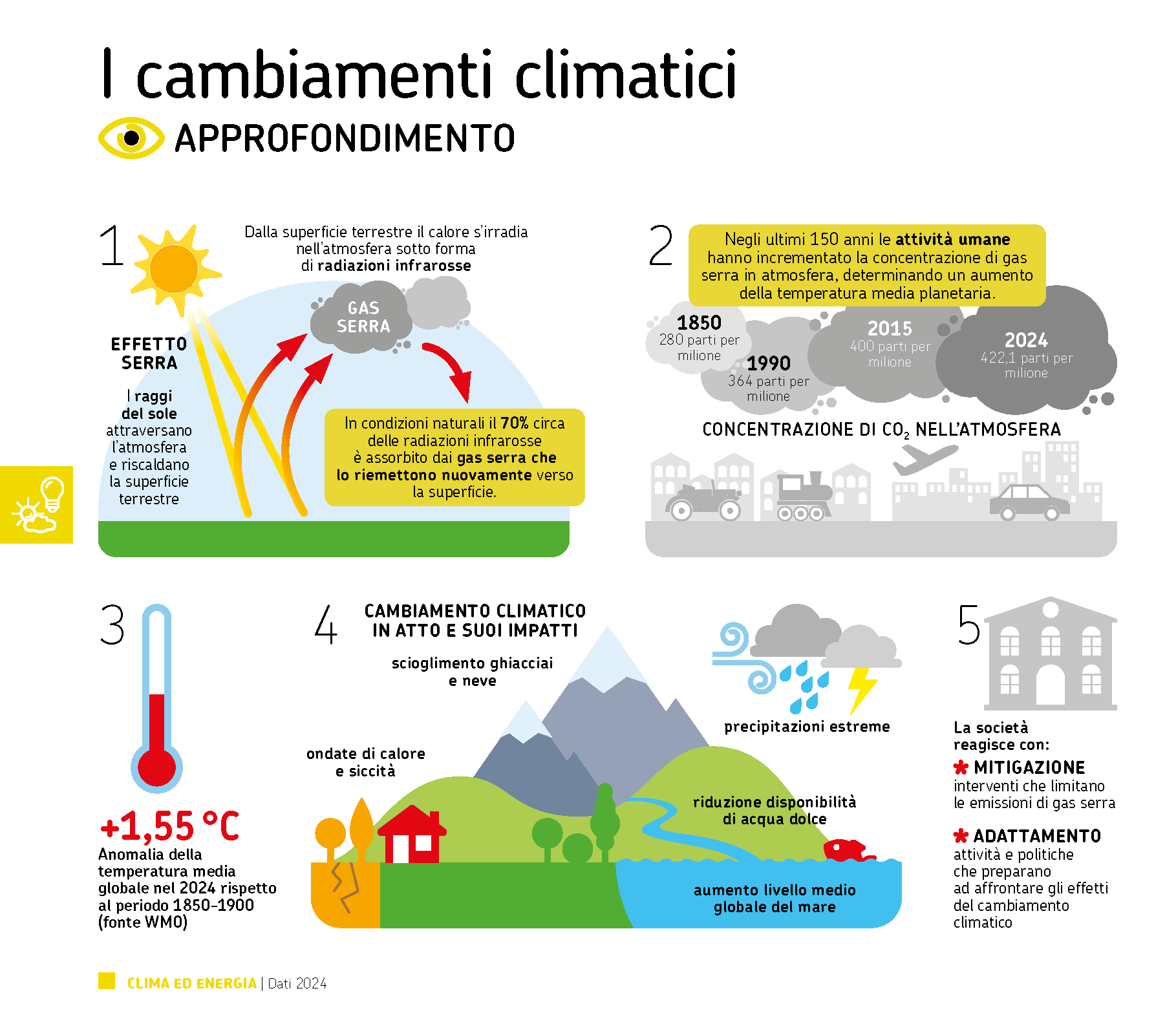 Questo si sta traducendo in fenomeni climatici estremi sempre più frequenti (ondate di calore, inondazioni, ecc) che necessitano l’adozione di misure sia di mitigazione (limitando le emissioni di gas serra), sia di adattamento (per contenere gli effetti dei cambiamenti climatici).