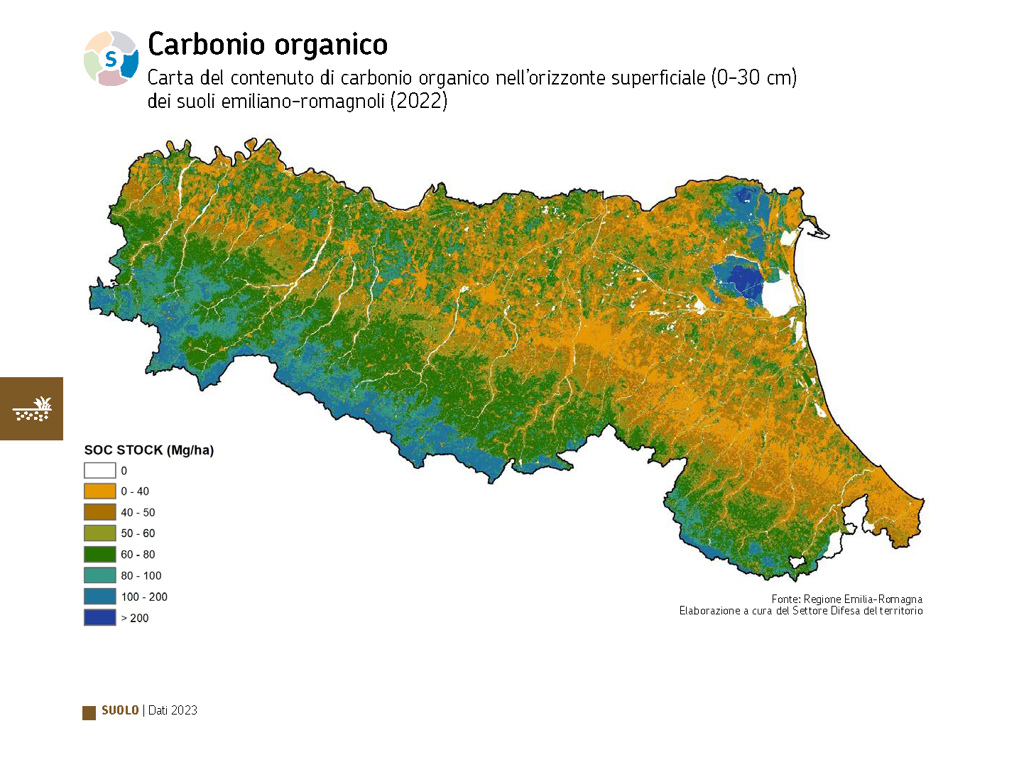Il contenuto di carbonio organico nei suoli varia a seconda del tipo di suolo e del suo uso in ambito agricolo e zootecnico. Nella nostra regione i territori boscati e seminaturali, che occupano il 30% della superficie, stoccano circa il 38% di tutto il carbonio organico mentre quelli agricoli, che occupano il 54%, ne contengono circa il 51%.
